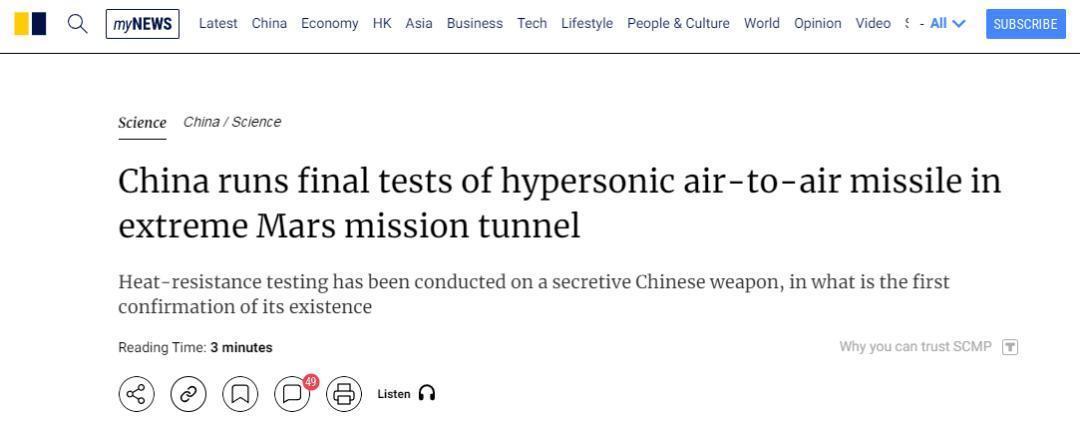 香港《南华早报》19日称,“中国公布的正式论文透露正在对一种秘密武器进行最终的耐热性测试,这也是首次证实了这种武器的存在”。报道称,发表在《设备环境工程》的这篇论文透露,中国高超音速空对空导弹已经经历了极端耐热测试,以满足中国空军严格的性能要求。这是官方首次证实这种神秘武器的存在,它可能对美国军用飞机构成前所未有的威胁,包括目前正在进行飞行测试的B-21隐形轰炸机。